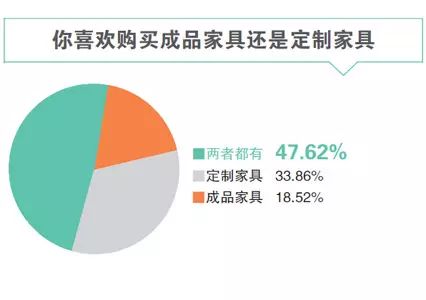 定制家具占比為33.86%,這與家具展上定制一頭獨大的場面有些出入,但并不意味著成品家具又將迎來春天,而是新中產(chǎn)在選購家具時更為審慎,47.62%表示將根據(jù)不同類型家具特點搭配成品家具和定制家具,考慮到定制意味著更高費用和更長時間,有選擇性定制不失為明智之舉。