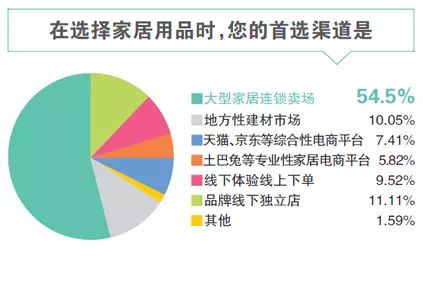 這群愿意自主選購家居用品的消費者,在選購時更青睞于何種渠道?調(diào)查顯示,大型連鎖家居賣場將是這個群體的主要去處,54.5%的受訪者表示將其列為自己選購家居用品的首選渠道;地方性建材市場、天貓及京東等綜合性電商平臺、土巴兔等專業(yè)家居電商平臺、線下體驗線上下單、品牌線下獨立店等方式都占比在10%上下,平分秋色。